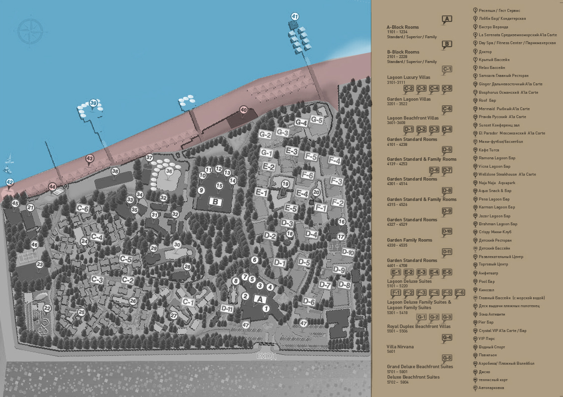 Аквапарк с 11 горками, который является самым большим в регионе, не даст скучать ни взрослым, ни детям. Взрослые также могут окунуться в 13 бассейнов, расположенных на территории отеля, в том числе один крытый, а также основной бассейн, заполненный морской водой. Каждый вечер на открытой площадке проходят профессиональные шоу-программы и тематические вечеринки.